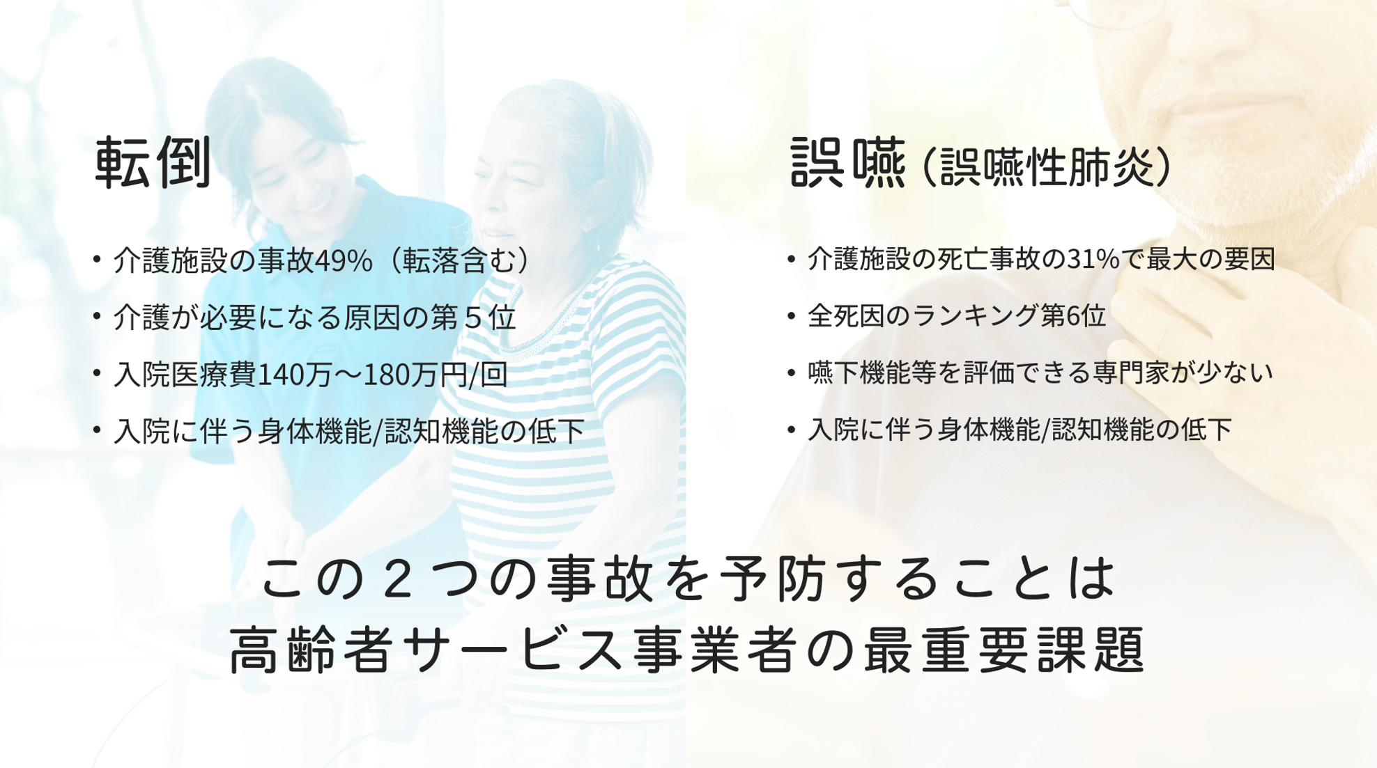 介護現場における大きなリスクの1つに「誤嚥性肺炎」があります。誤嚥性肺炎とは食べ物や飲み物の一部などが気道に流入する「誤嚥」が原因となって起こる肺炎で、介護現場での死亡事故原因の最大の要因(約31%)となっています。また、介護施設内だけでなく、日本人の全死因の中でも第6位と多くを占め、特に高齢になるとその比率が上昇するため、高齢者の誤嚥性肺炎防止が重要な社会課題となっています。