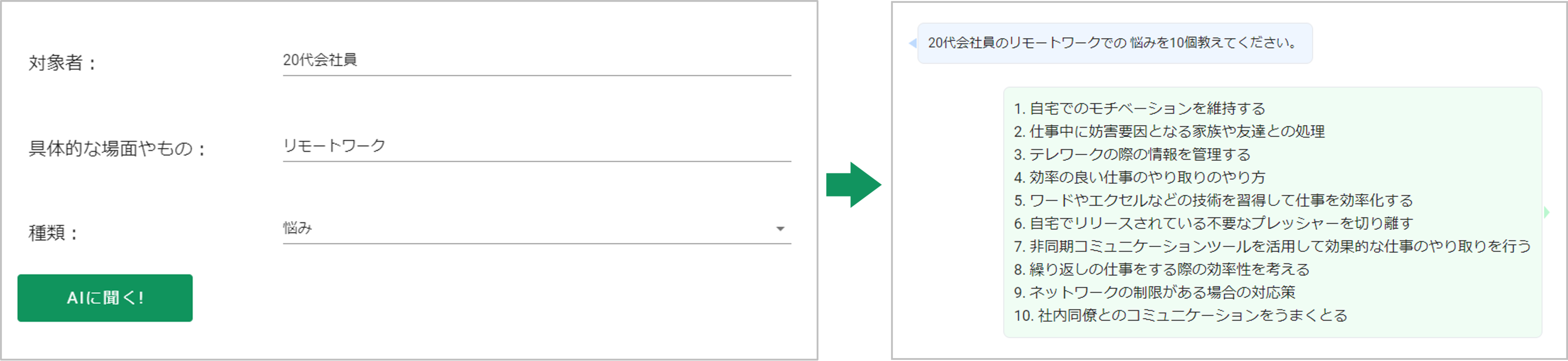 IDEA GARDENの画面上で「対象者」と「具体的な場面やもの」、悩みやアイデアといった「種類」を入力すると、その内容をもとに質問が作成され、AI発想アシスタントが回答します。