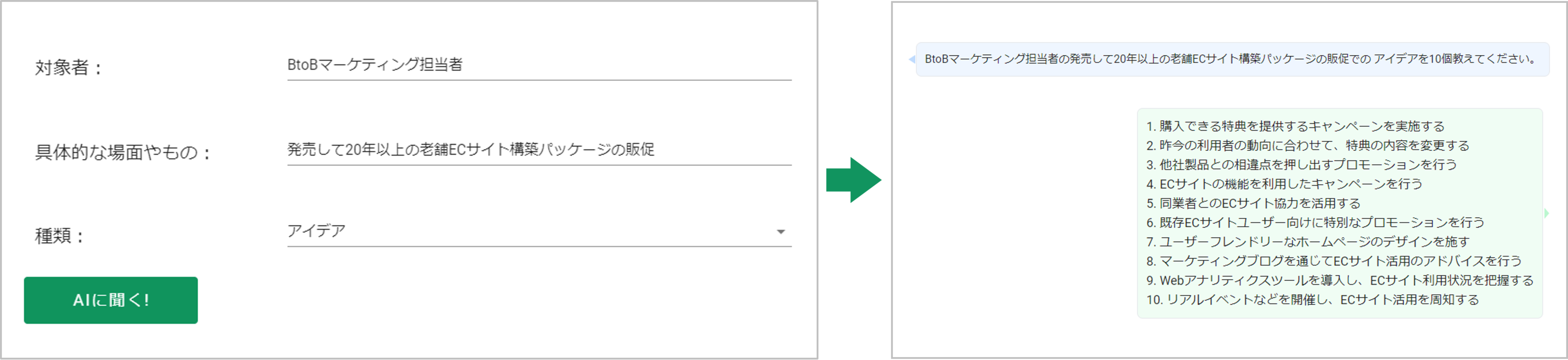 「BtoBマーケティング担当者」の「発売して20年以上の老舗ECサイト構築パッケージの販促」の「アイデア」