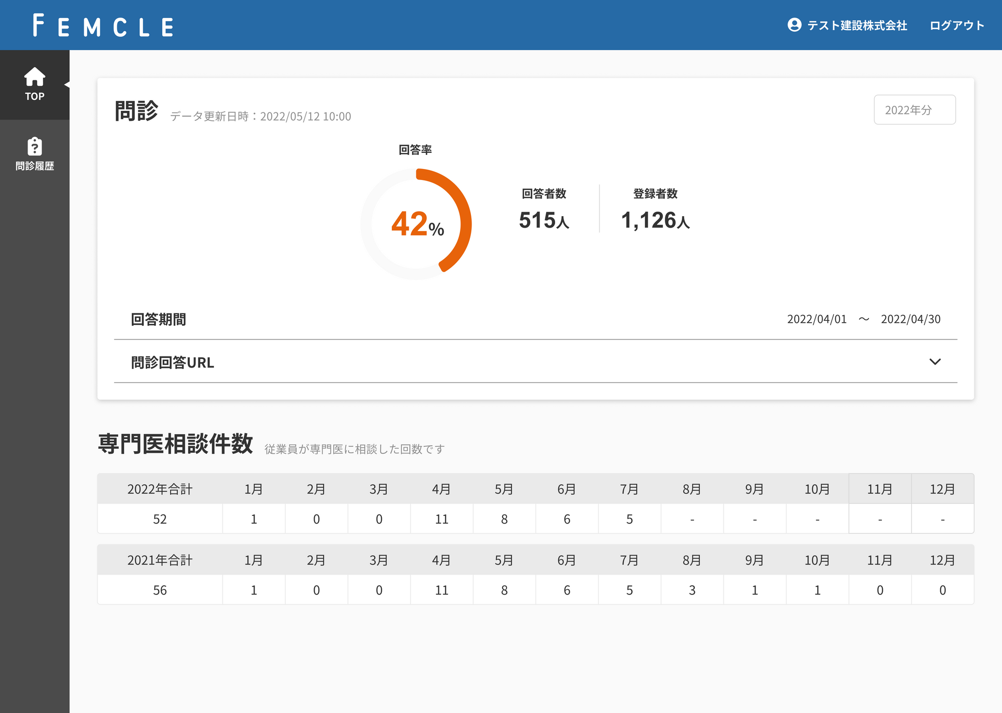 社員の回答者数、回答率、実施時期など過去の問診データを確認できます。(担当者が個別データを閲覧することはありません)