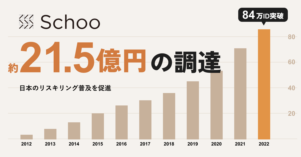 当社では2011年の創業以来、社会人向けオンライン学習サービス「Schoo(スクー)」を提供し、登録会員数は84万人と多くのユーザーのリスキリングを支援してまいりました。法人の導入数も2020年から約2倍となる2900社にご利用いただき、企業における人材の育成支援にも取り組んでいます。