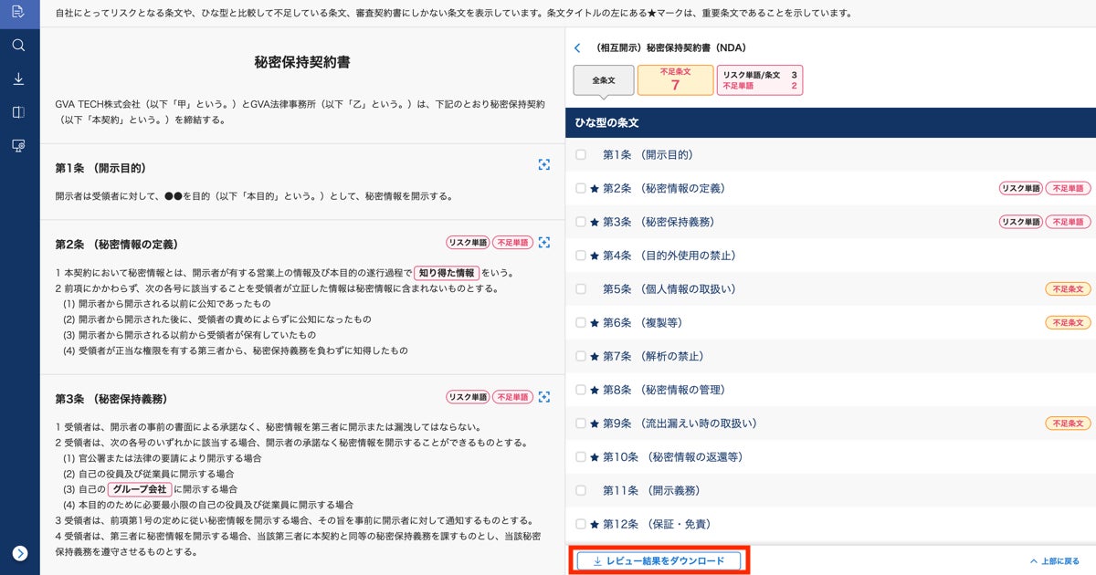 GVA TECH株式会社(本社:東京都渋谷区、代表取締役:山本 俊、以下GVA TECH)は、AI契約書レビュー支援クラウド「GVA assist」が、審査結果の出力機能をリリースしたことをお知らせいたします。