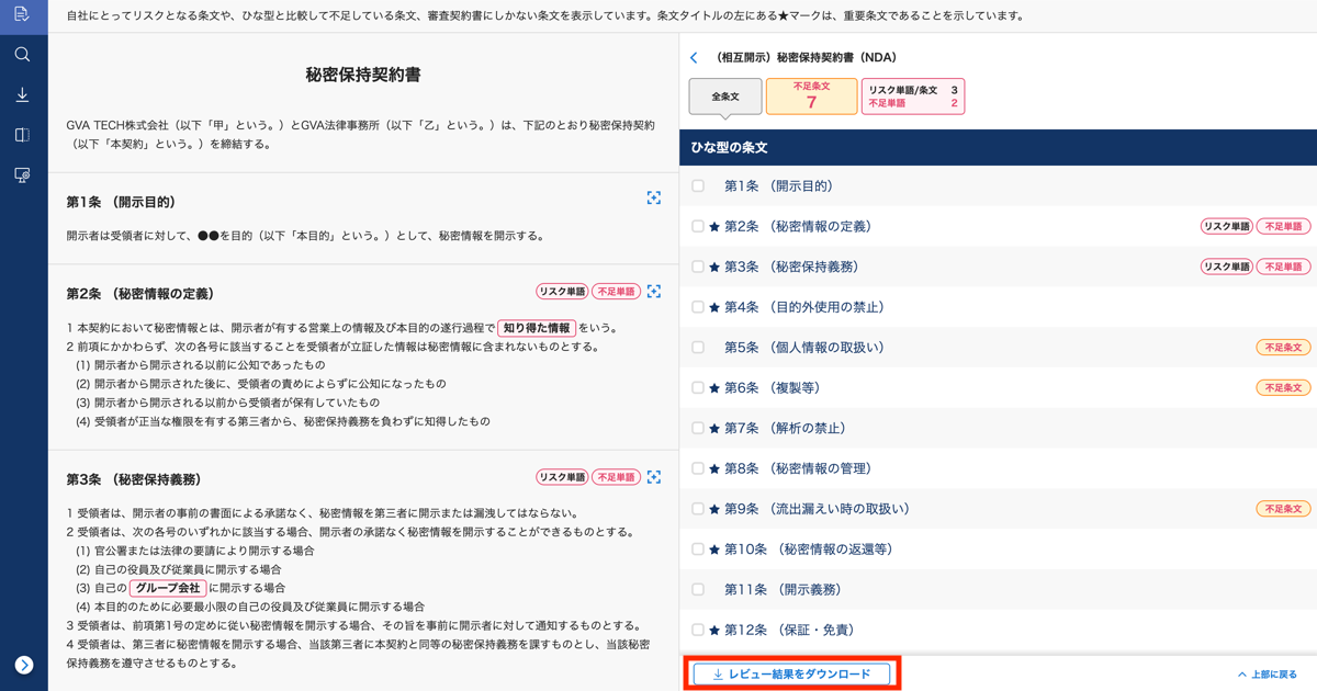 - 審査対象の契約書と、GVA assistに搭載されている契約書との比較・突合結果を、ワンクリックでExcelファイルとしてダウンロードできる機能です。