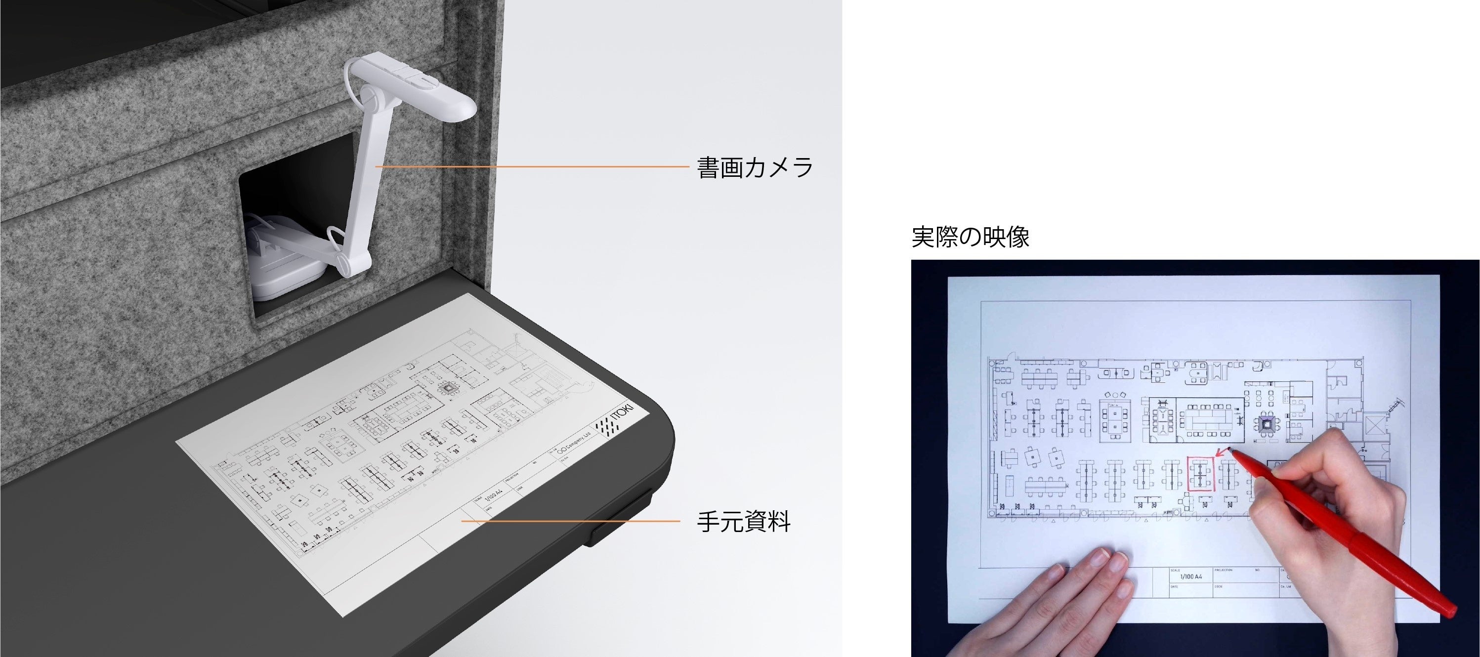 書画カメラを標準装備しています。カメラを切り替えることで、手書き資料や手元のものをリアルタイムで投影することができます。
