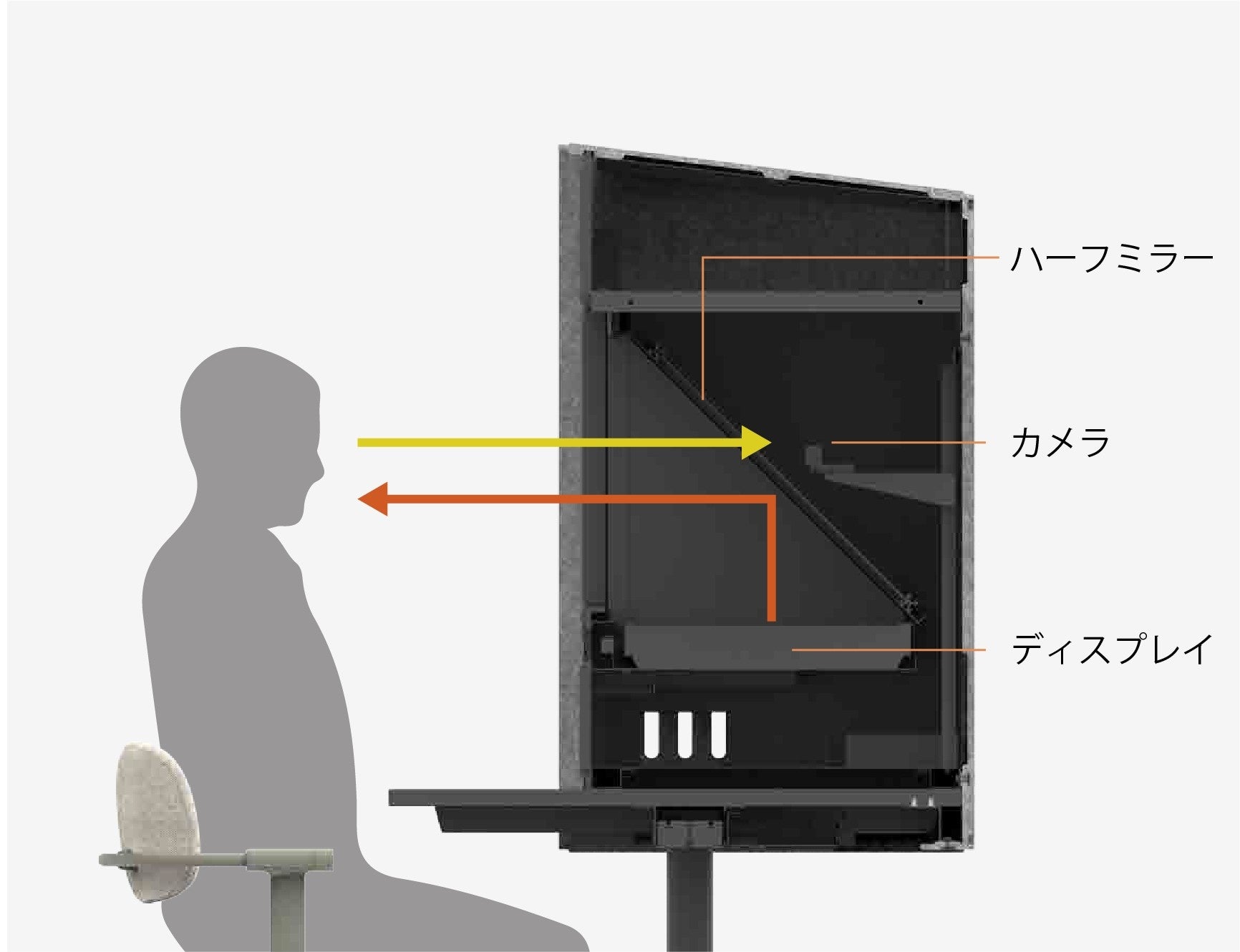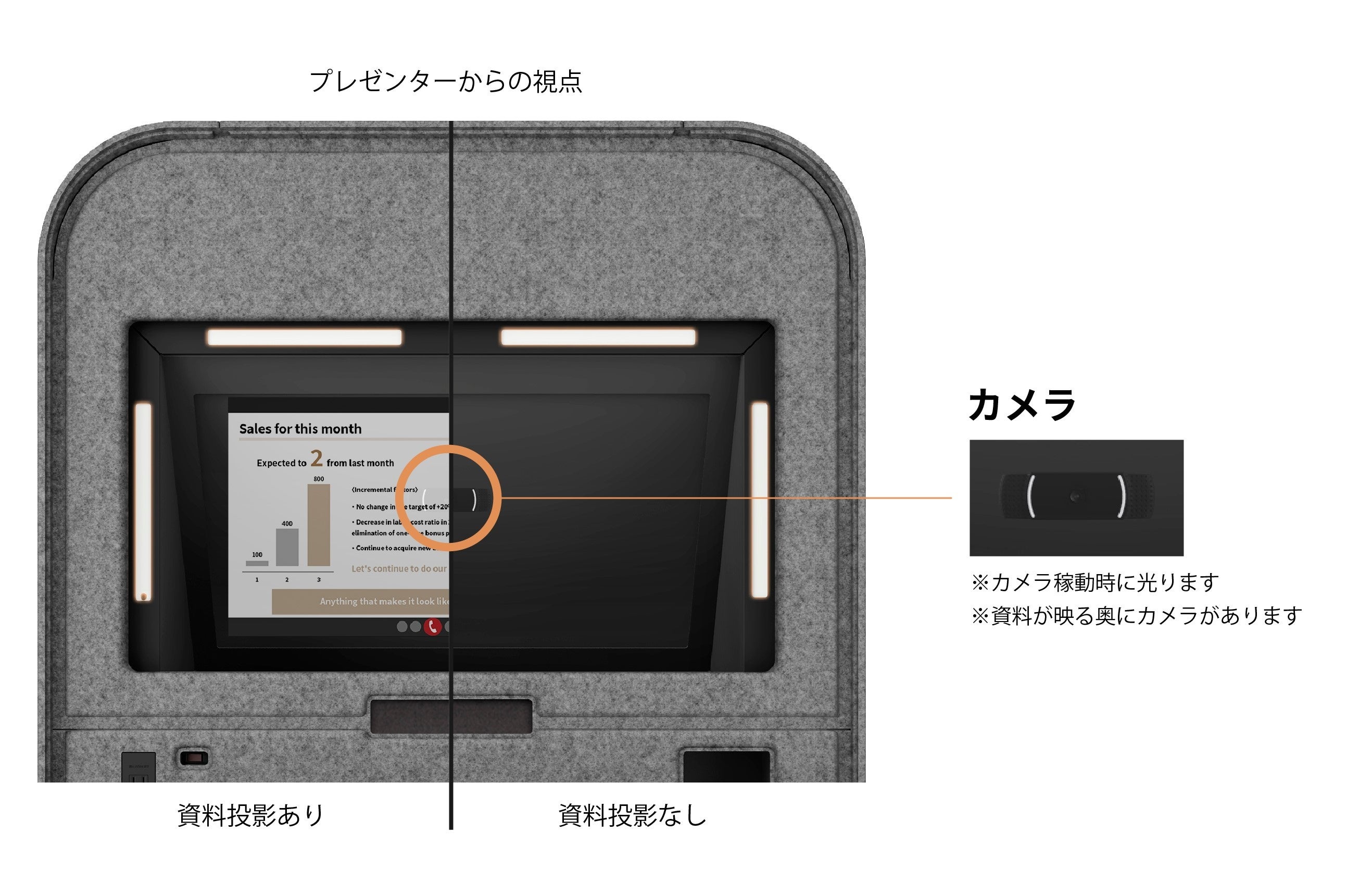 FULL HDカメラがハーフミラー越しに設置されていることで、32インチ相当の大画面に映るPC資料を見ながら話すことができ、プロンプターを使用したような目線を落とさない好印象なプレゼンにつながります。また、上下調節機能で体格・視線に合わせた高さ調節ができます。