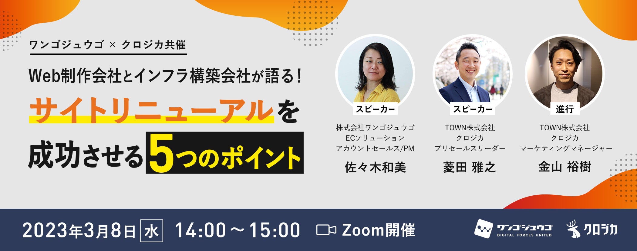 このたび、WEBサイトの企画制作およびサイト運用支援サービスをしている株式会社ワンゴジュウゴ(本社:東京都千代田区 代表取締役 秋山 政紀)と「黒字化をカジュアルに」をビジョンに掲げ、WEBサイトのクラウド化を支援する「クロジカ」を展開するTOWN株式会社(本社:東京都中央区 代表取締役 永井 哲)は、共催で “サイトリニューアル”をテーマにしたウェビナーを開催します。