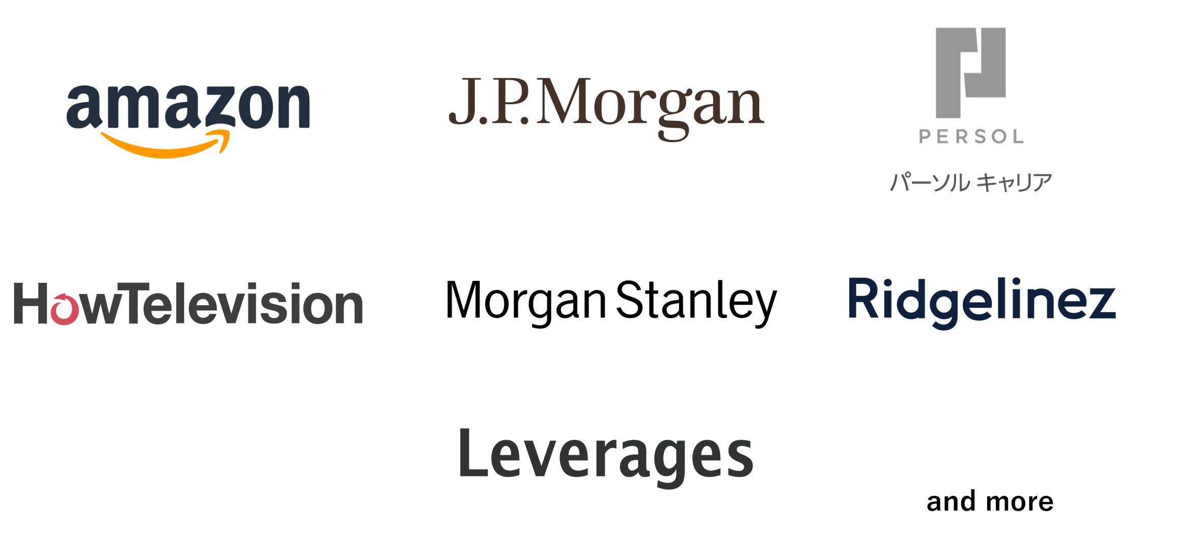 アマゾンジャパン / J.P.モルガン / パーソルキャリア / ハウテレビジョン / モルガン・スタンレー / Ridgelinez / レバレジーズ(50音順)