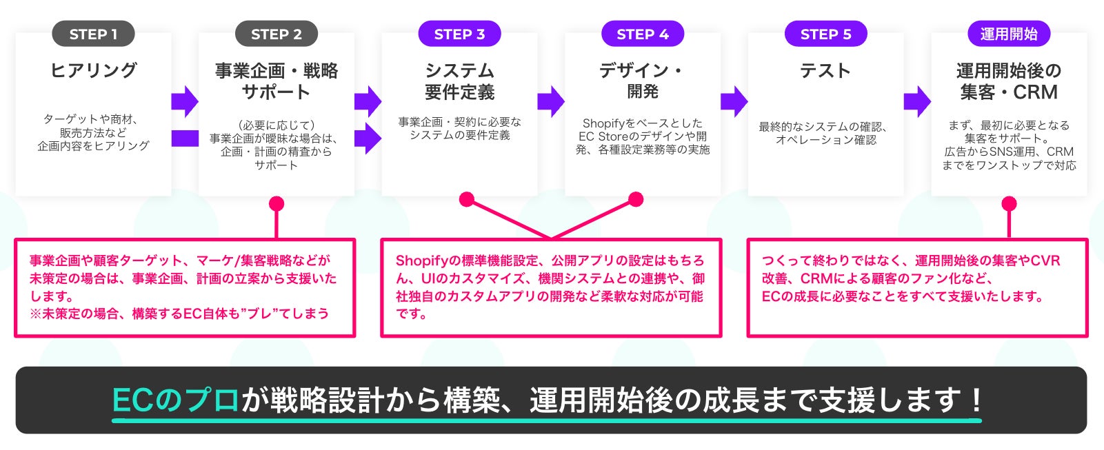ECに必要な要素をワンストップで 提供しているから、ベンダー間の齟齬なく、効率的に成果を最大化します。集客はもちろん、LTVの向上、解約率の改善などECに関することはすべてご相談ください。