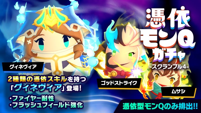 憑依型のモンQのみが排出される「憑依モンQガチャ」に、モンストでおなじみの「グィネヴィア」「ゴッドストライク」「ムサシ」が味方のオバケ「モンQ」としてガチャに登場します。