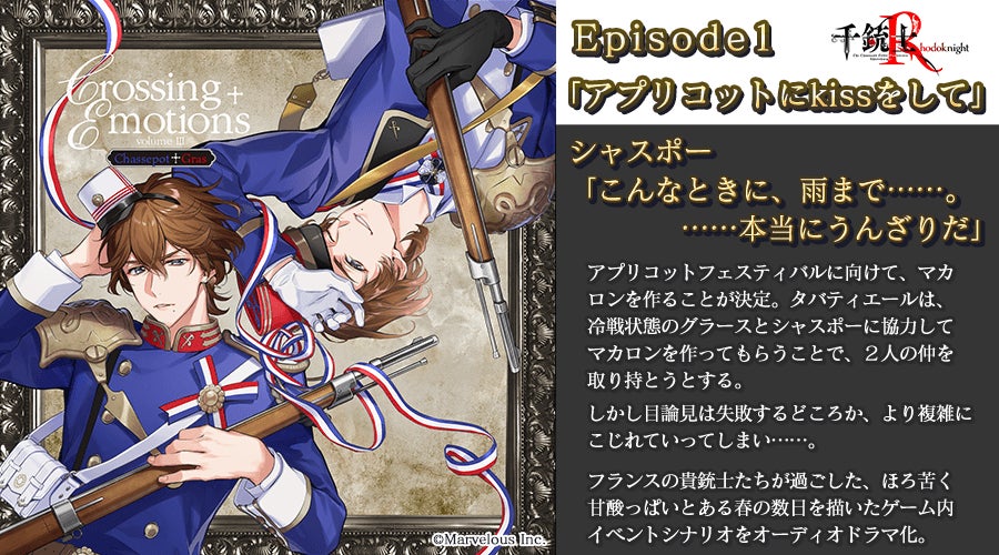 株式会社マーベラス(代表取締役社長:佐藤 澄宣/所在地:東京都品川区)による、スマートフォンゲーム『千銃士:Rhodoknight』(読み:せんじゅうし ろーどないと 以降、『千銃士R』)は、シャスポー(江口拓也)とグラース(寺島拓篤)のキャラクターソングやオーディオドラマが収録されているCD「Crossing Emotions volume III シャスポー♰グラース」を本日発売いたしました。また、同CDに収録されているシャスポー(CV:江口拓也)による楽曲「odd Macaron」、グラース(CV:寺島拓篤)による楽曲「Fake to Face」のリリックビデオを公開いたしました。