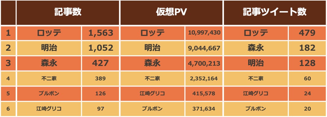 ・明治が記事数、仮想PVで2位。1位との差は記事数では大きいが仮想PVでは小さい。