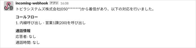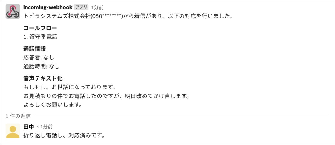 新機能をご活用いただくことで、現在ご利用されている社内コミュニケーションツールで外線着信時の応対状況が簡単に確認できます。不在中の外線着信の確認、折り返し電話対応の円滑化や対応漏れの防止、社内の情報共有効率化を図ることが可能です。ビジネス電話の業務効率化に新機能をぜひご活用ください。