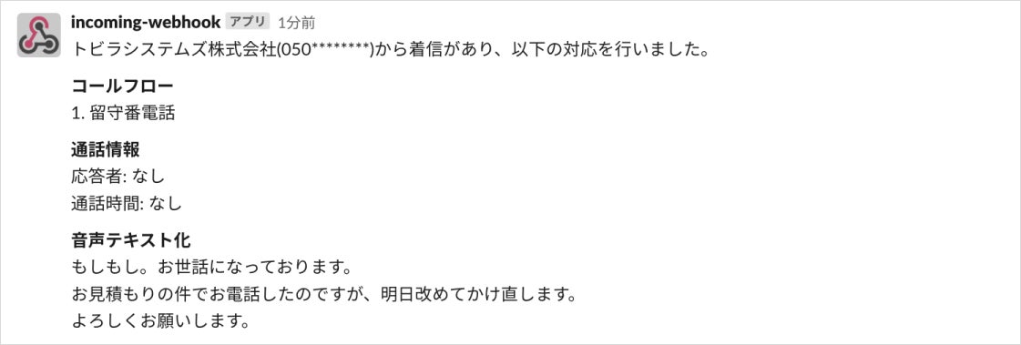 今回のアップデートにより、「トビラフォン Cloud」で外線着信時に各種コミュニケーションツールへ通知する機能が追加されました。「トビラフォン Cloud」で受けた外線着信の応対状況を、お客様がご利用のコミュニケーションツールに通知することで、不在中に誰からどのような電話があったかを簡単に確認することができます。