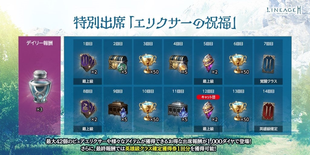 デイリー報酬として「ピュアエリクサー(刻印)」3個のほか、「浄化の英雄級クラス確定獲得券(1回)(刻印)」や「浄化の最上級クラス/アガシオン獲得券(11回)(刻印)」などのアイテムを獲得できます。