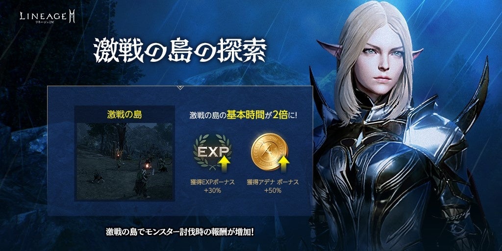 さらに「激戦の島」内のモンスターを討伐時に得られるアデナの獲得量が50%増加し、EXPの獲得量が30%増加します。