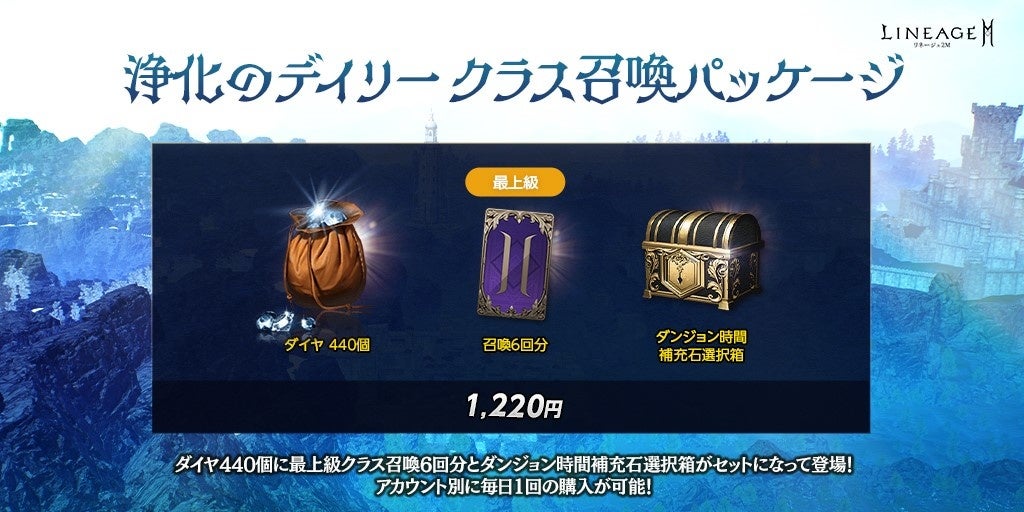 ダイヤ440個のほか、「浄化の最上級クラス獲得券(6回)(刻印)」、「浄化のダンジョン時間補充石(刻印)」がセットになった「浄化のデイリー クラス召喚パッケージ」が登場しました。