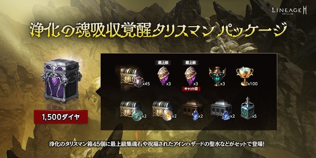 「浄化のタリスマン箱(刻印)」45個や「浄化の最上級集魂石(11回)(刻印)」3個、「中級覚醒のポーション(刻印)」5個などがセットになった、「浄化の魂吸収覚醒タリスマン パッケージ」が登場しました。