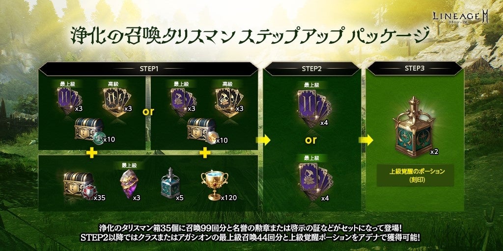 その「ドラゴンのタリスマン」が入った「浄化のタリスマン箱(刻印)」35個に、クラスまたはアガシオンの召喚66回分、「中級の覚醒ポーション(刻印)」5個などがセットになった「浄化の召喚ステップアップ パッケージ」が登場しました。