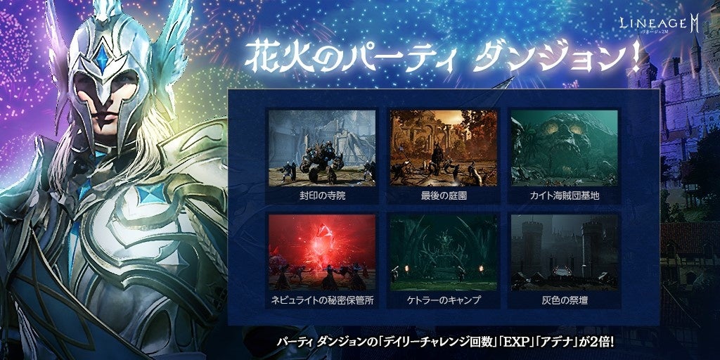 期間中、「パーティ ダンジョン」でのモンスター討伐時に獲得できる「EXP」と「アデナ」が2倍になり、1日に「パーティ ダンジョン」に挑戦できる回数も2回に増加します。