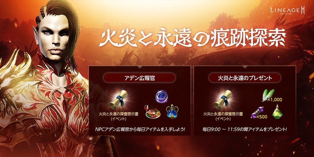 期間中、アデン大陸の各村に出現するイベント NPC「アデン広報官(イベント)」に話しかけることで、アデナを使用して「継承者の霊薬/晩餐/聖水(イベント)」や「火炎と永遠の探査啓示書(イベント)」と交換することができます。