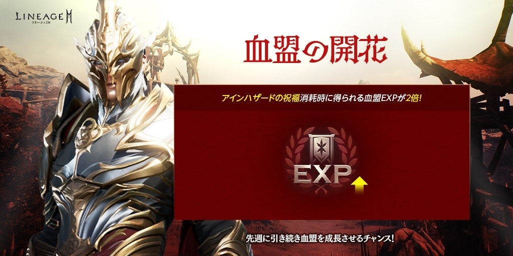 期間中、アインハザードの祝福消耗時に獲得できる血盟EXPが2倍に増加します。この機会にたくさんのモンスターを討伐して、血盟のレベルを上げましょう。