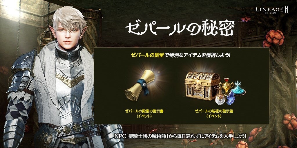 期間中、アリーナ ダンジョン「ゼパールの殿堂」のロビーに、イベントNPC「聖騎士団の魔術師(イベント)」が出現します。