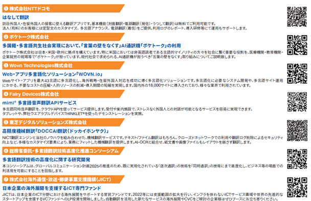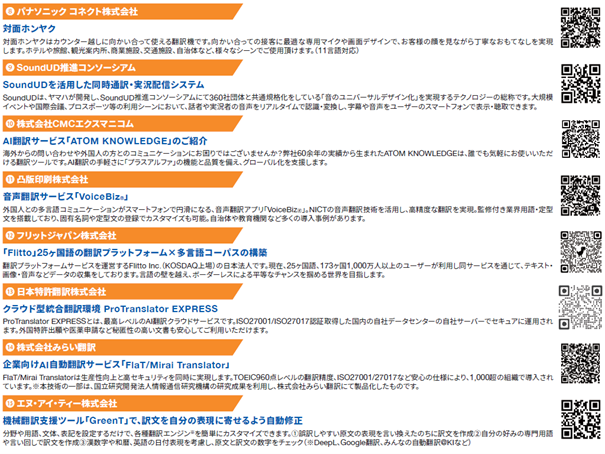 ・昨年秋以降、日本国内への海外からの旅行者が増加しており、今後も多言語翻訳の重要性はさらに重要になっていく中、リアル開催となった今年度の開催では会場展示に過去最多の24者から出展があった。