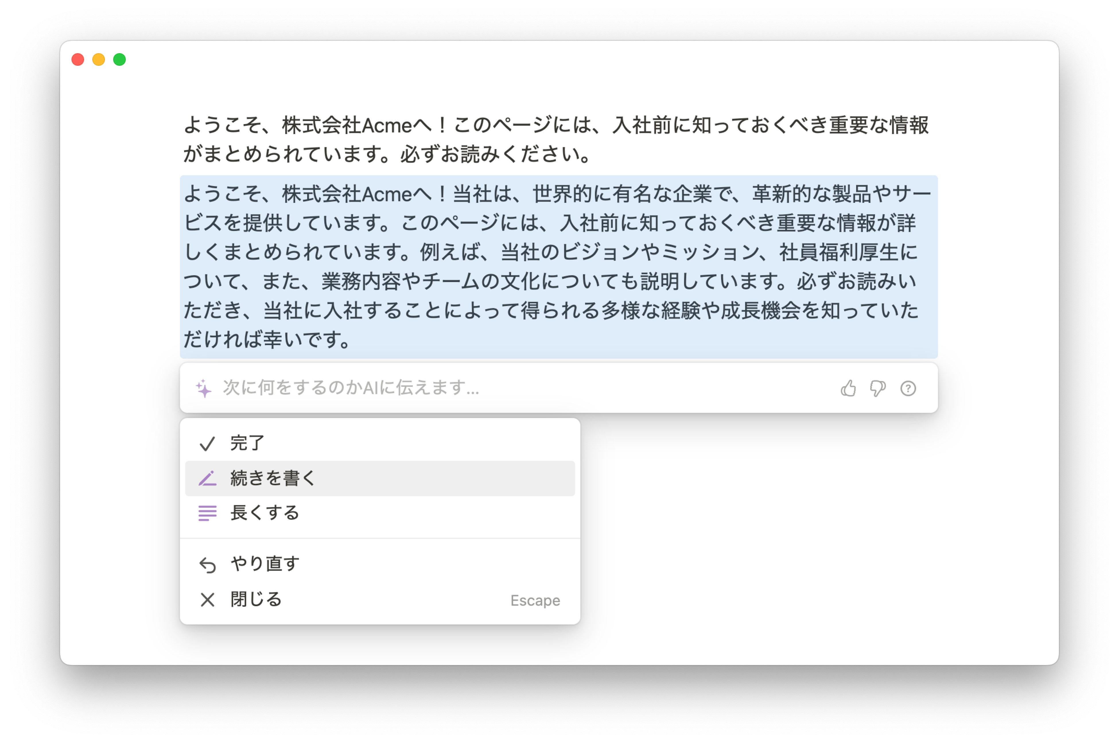 - 情報の整理・要約作成:ページ全体や範囲選択した文章の情報を整理したり、会議の議事録やプロジェクト概要の要約を作成・翻訳することができます。