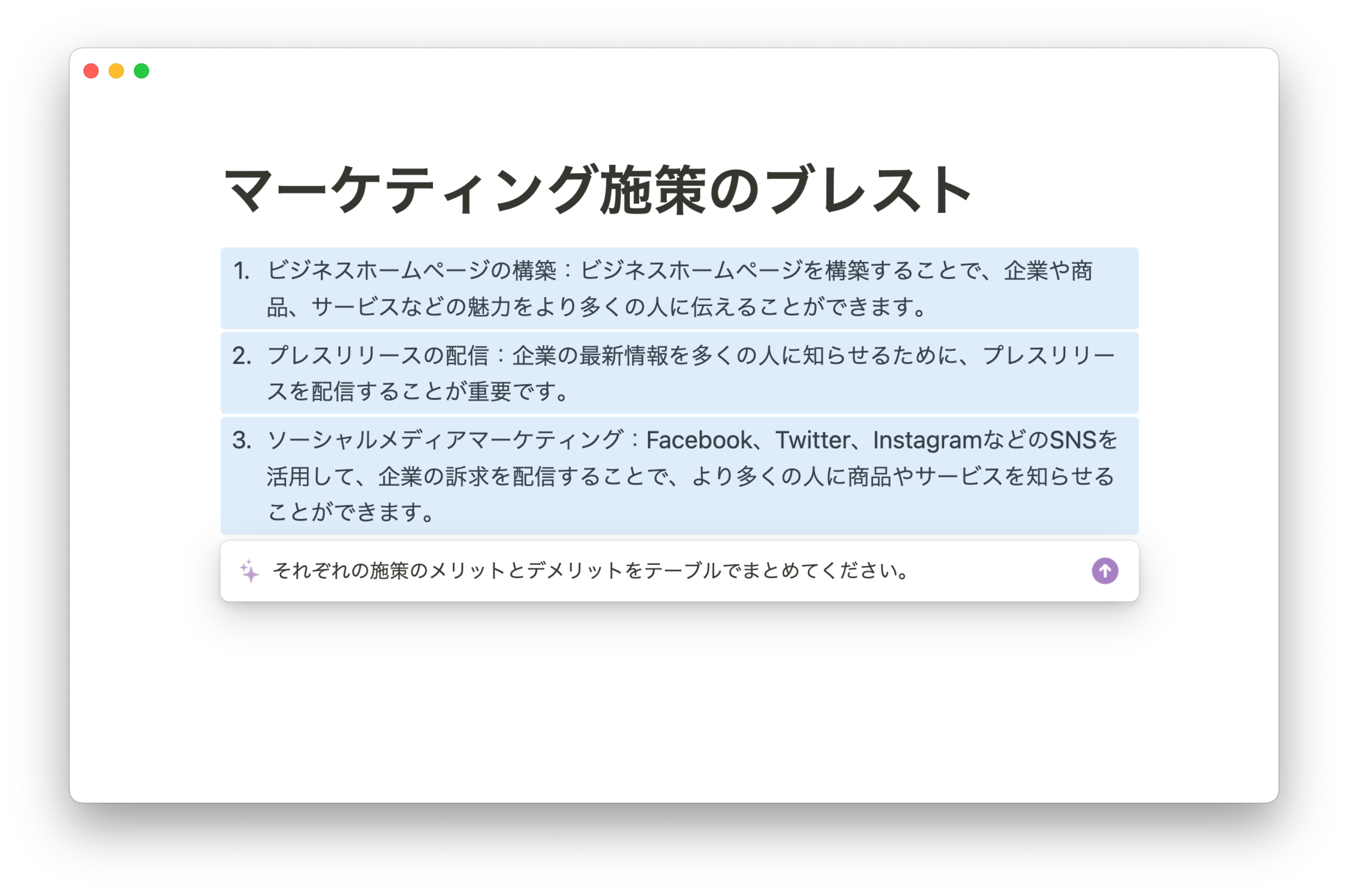 - 新しいアイデアのヒントを得る:アイデアのブレインストーミングをサポートしたり、メリット・デメリットのリスト化、ブログ、プレスリリース、会議のアジェンダなどさまざまなトピックスに対してドラフトを作成します。