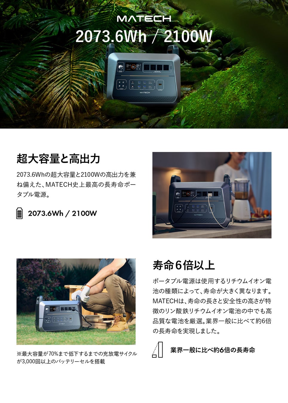 MATECH PowerZ Pro 2000 ポータブル電源には安全性の高い「LiFePO4(リン酸鉄リチウムイオン電池)」が採用されており、一般的なポータブル電源の約6倍の高耐久バッテリーを実現(充放電サイクルは3,000サイクル(残存70%想定)、6,000サイクル(残存50%想定)を実現しています)。これにより、10年〜20年と末長くご使用いただけます。