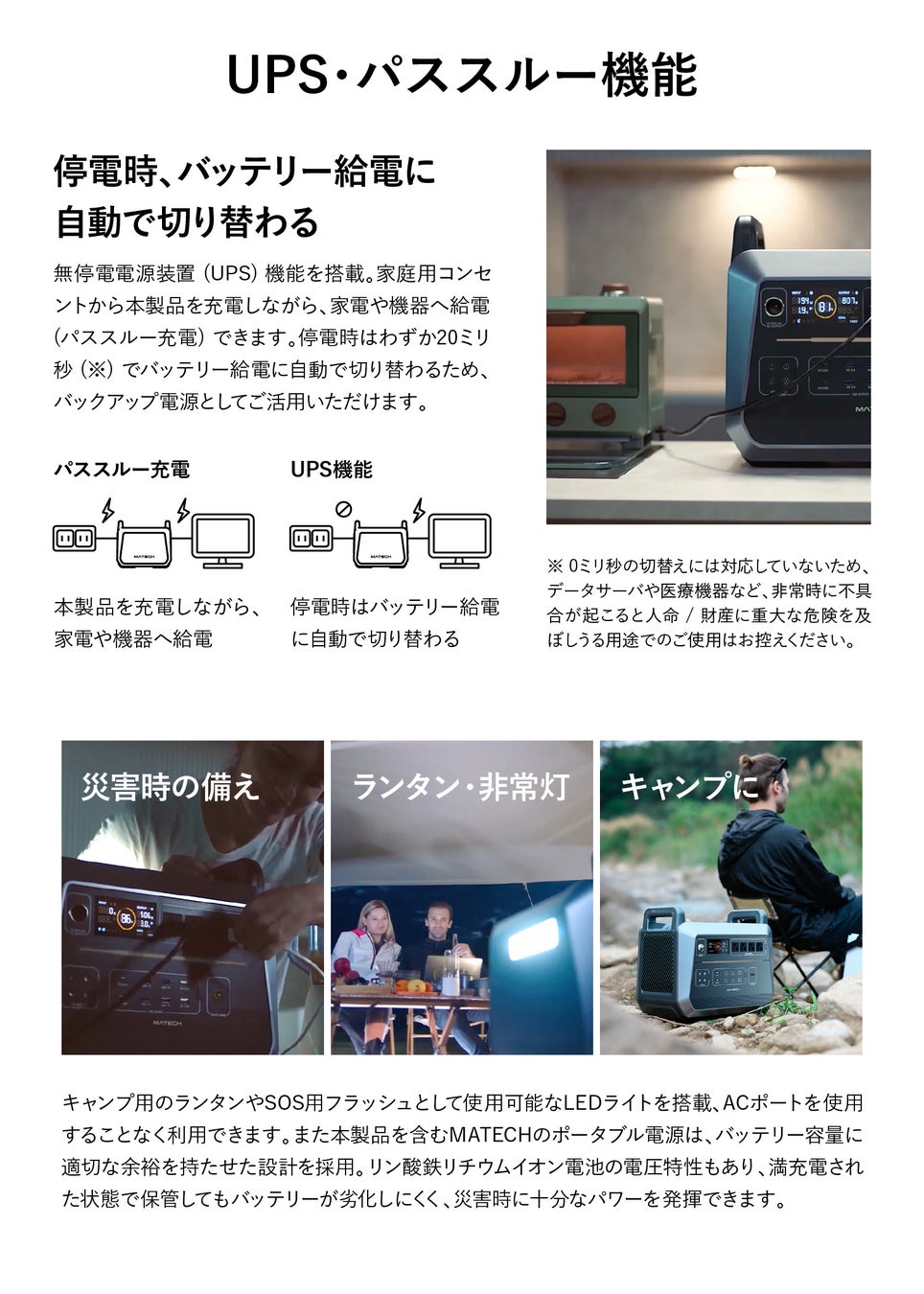 ACコンセントから本製品に繋げながら、他の端末に給電を同時に行っている場合、端末に電力供給しているのは、ポータブル電源ではなく、壁のACコンセントとなります。ACコンセントからの電力供給が停止した場合、15ms以内に本製品のバッテリーから直接電力供給が行われるモードに自動的に切り替わります。また、本機はパススルー充電(出力端子に機器を接続して給電しながら、本機自体にも充電すること)に対応しています。