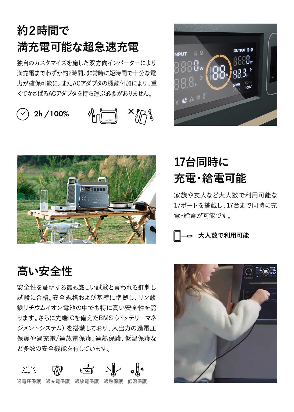 急速充電テクノロジーによって、2時間でフル充電、1時間半で80%まで充電可能です。急な出発前でも電池残量足りないという不安はなし!充電テクノロジーにより、標準的なご家庭のACコンセントから1200Wの急速充電が可能になりました。