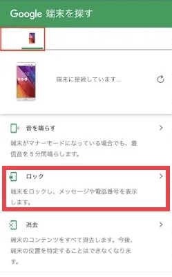 Step2:ロックを解除したいAndroidスマホを選択して、「ロック」を選択します。