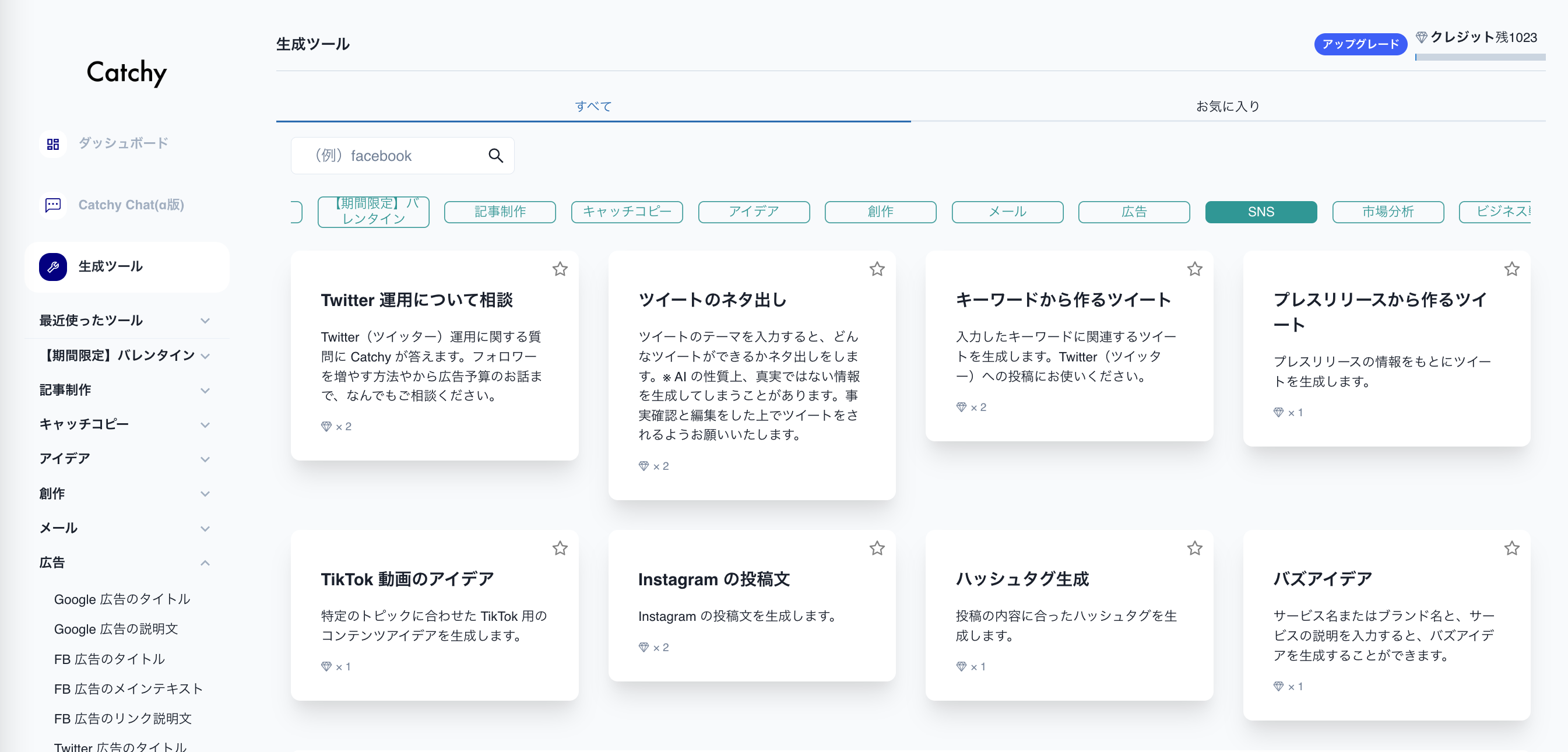 Catchyに会員登録後、パソコンをご利用の場合は左サイドバーの「生成ツール」→「SNS」→の順にクリックし、「Twitter 運用について相談/ツイートのネタ出し/キーワードから作るツイート/プレスリリースから作るツイート」から選んでお使いください。