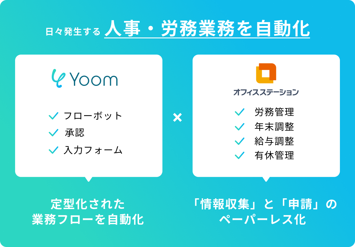オフィスステーションは労務・年末調整・給与明細・有休管理・マイナンバー管理など、業務単位ごとに必要な機能を導入できる「アラカルト型」人事労務クラウドソフトです。これまでの人事・労務担当者の煩雑な事務作業の負担を軽減し、労働生産性の向上や会社のコスト削減に貢献しています。「Yoom」は同サービスとノーコードで連携し、人事労務の処理件数の多い企業において、全社規模で労務管理に始まる処理業務の負担を軽減します。