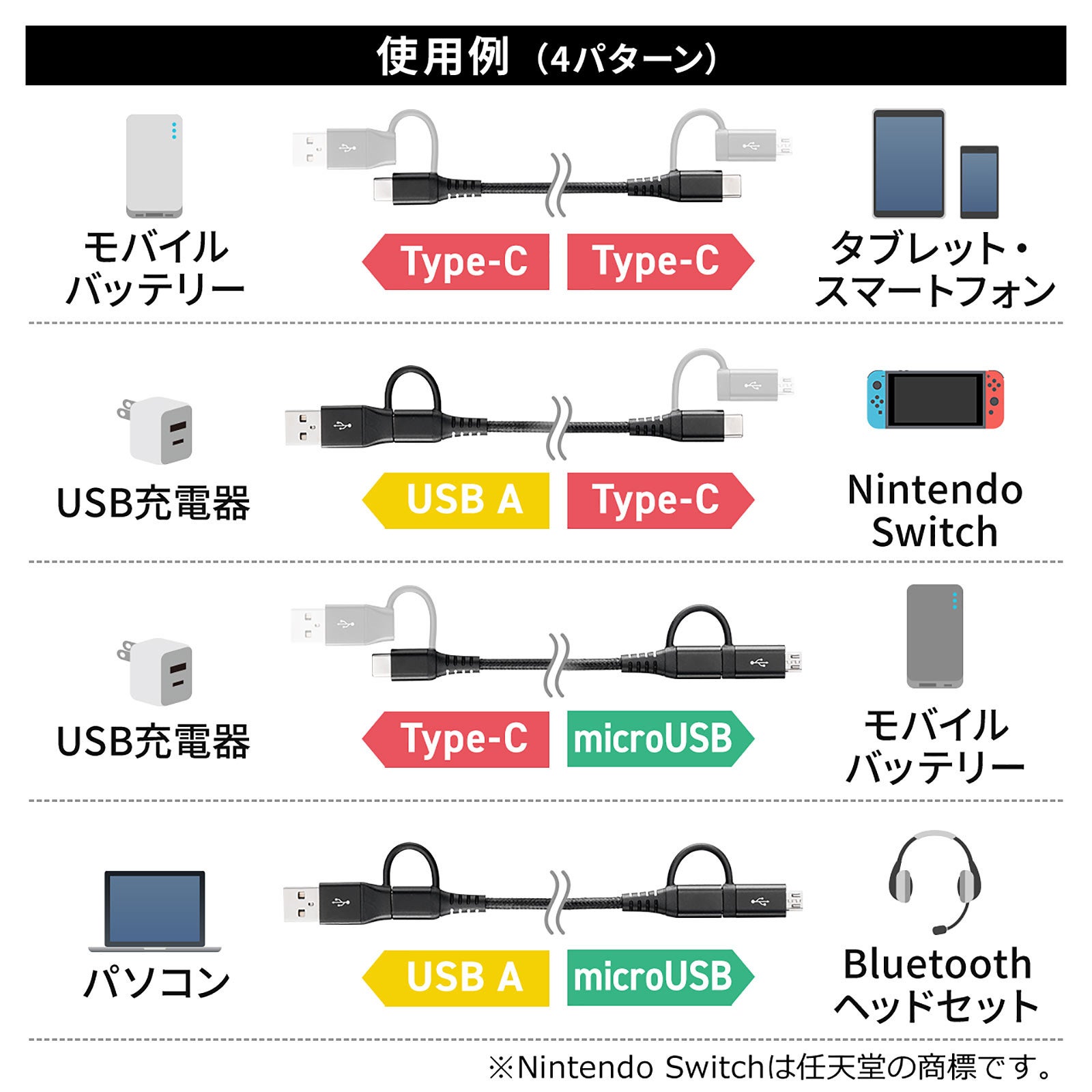 本製品は、変換アダプタを付け替えることで4種類のケーブルとして使用できる、4in1 USBケーブルです。