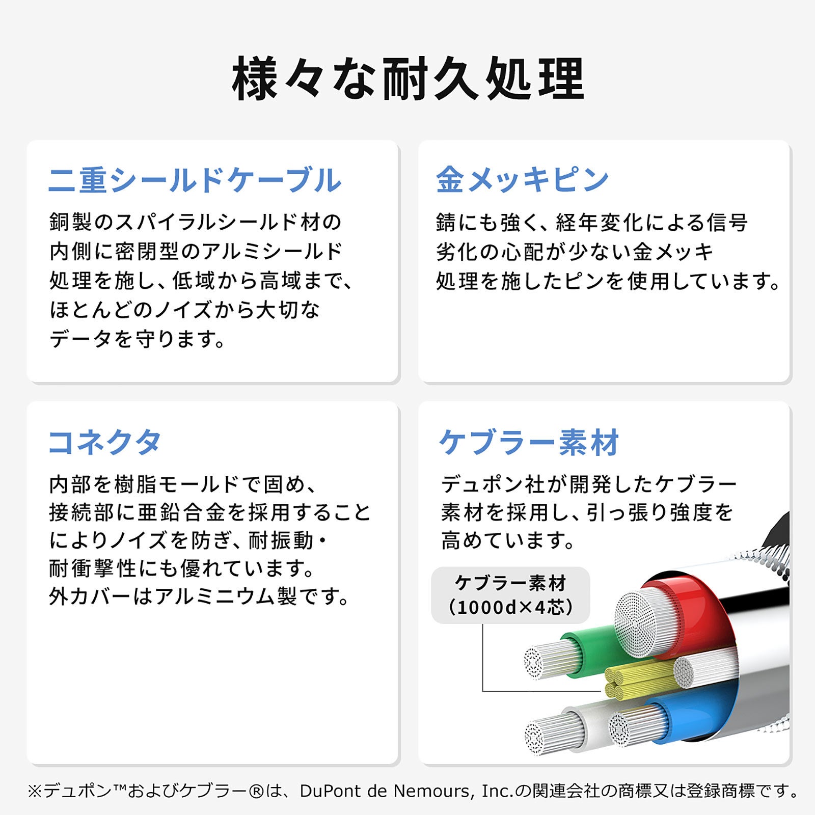 折り曲げ耐久試験50000回、荷重試験70kgfをクリアした高耐久仕様です。引っ張りによる断線を防止するため、防弾チョッキの素材としても使用されるケブラー繊維をケーブル内部に使用して補強しています。