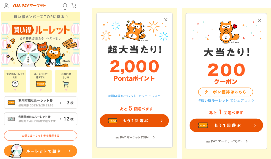 そのほか、通常のルーレット券とは異なりクーポンのみがあたる「お試しルーレット券」を、au PAY マーケットで購入履歴のないお客さま限定で配布します。