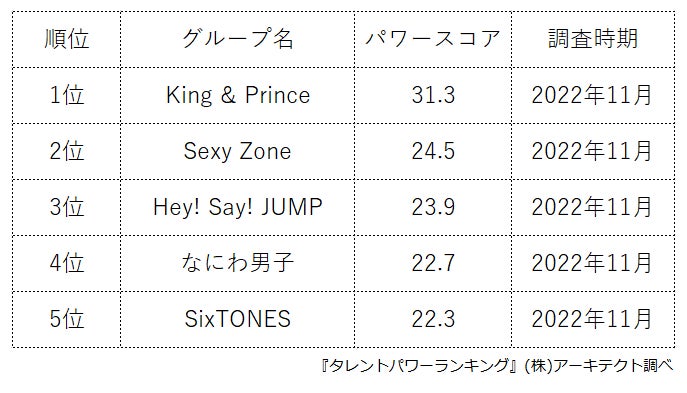 『タレントパワーランキング』では、タレントパワーランキングに登録されている日本のボーイズグループのスコアを調査。