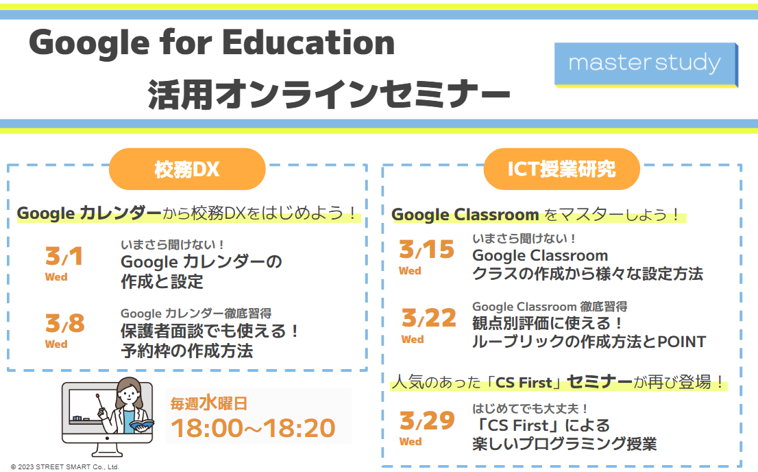 株式会社ストリートスマート(所在地:大阪府大阪市北区、代表取締役:松林 大輔)が運営する先生のための総合プラットフォーム「master study(マスタースタディ)」では、会員様に向けて「Google for Education™ 活用オンラインセミナー」を定期的に開催しています。