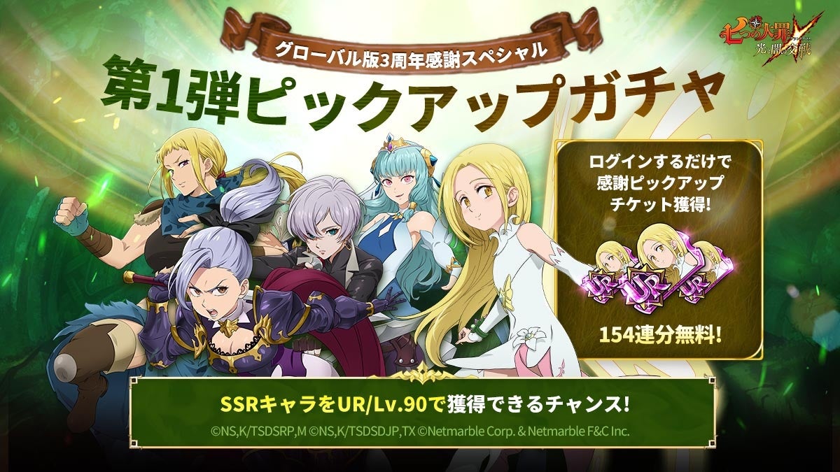 期間中にログインすると、最大154連ガチャを無料で引くことができ、排出されるSSRキャラクターは全てURレベル90で獲得できます。