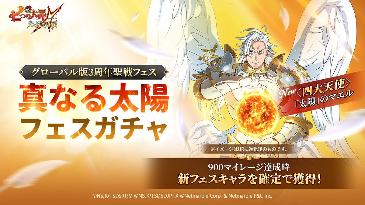 また、このグローバル版3周年聖戦フェス~真なる太陽フェスガチャ~では、【歪められた闇】暴走 エスタロッサ、【取り戻した記憶】輪廻のエリザベス、【「閃光」の降臨】光の盟約 リュドシエル、【「大海」の降臨】光の盟約 タルミエル、【「竜巻」の降臨】光の盟約 サリエル等のSSRキャラもラインナップするほか、ガチャの回数に応じて貯まるマイレージ報酬では、900マイレージ到達で〈四大天使〉「太陽」のマエルを入手できますので、この機会にぜひ手に入れてください。