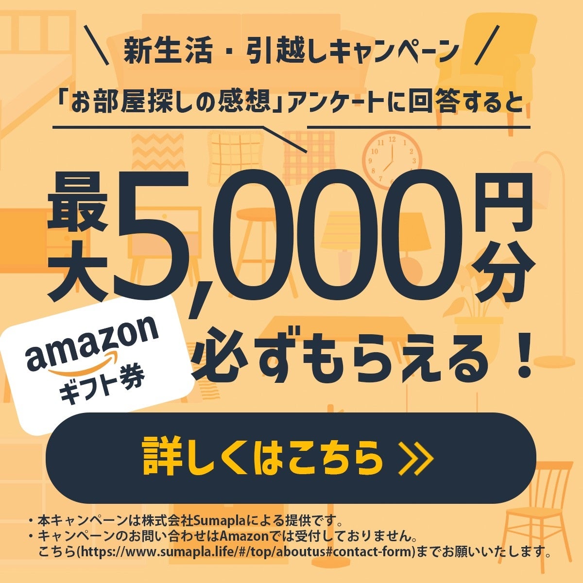 株式会社Sumapla(本社:東京都渋谷区、以下 スマプラ)は、お部屋探し感想アンケートに回答すると、もれなくAmazonギフト券(最大5,000円)”がもらえる「新生活・応援キャンペーン」を開始した。