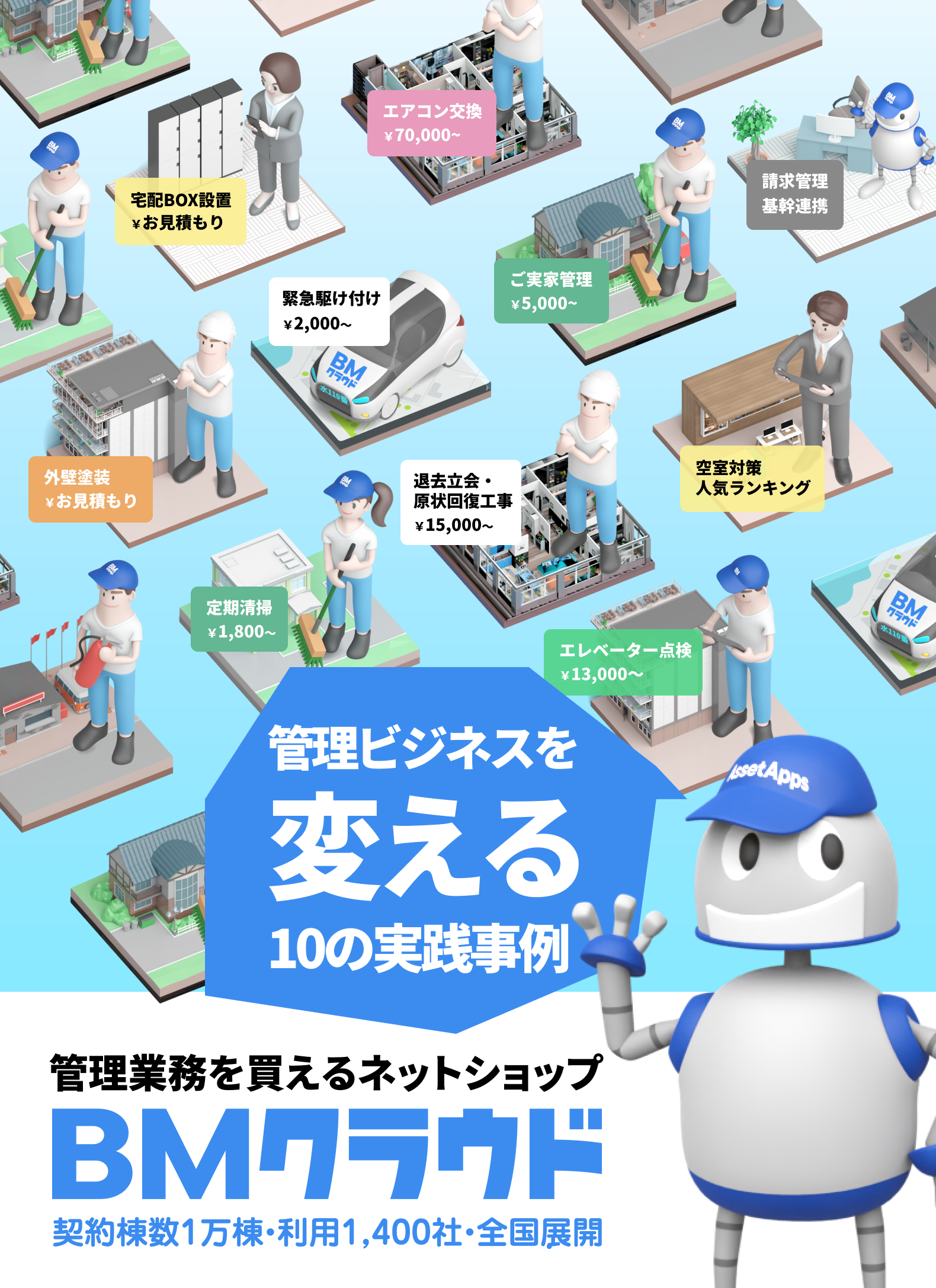 BMクラウドは、オンライン上で簡単に、賃貸経営に欠かせない建物管理サービス(清掃・点検・原状回復など)の見積・発注が可能なシステムです。
