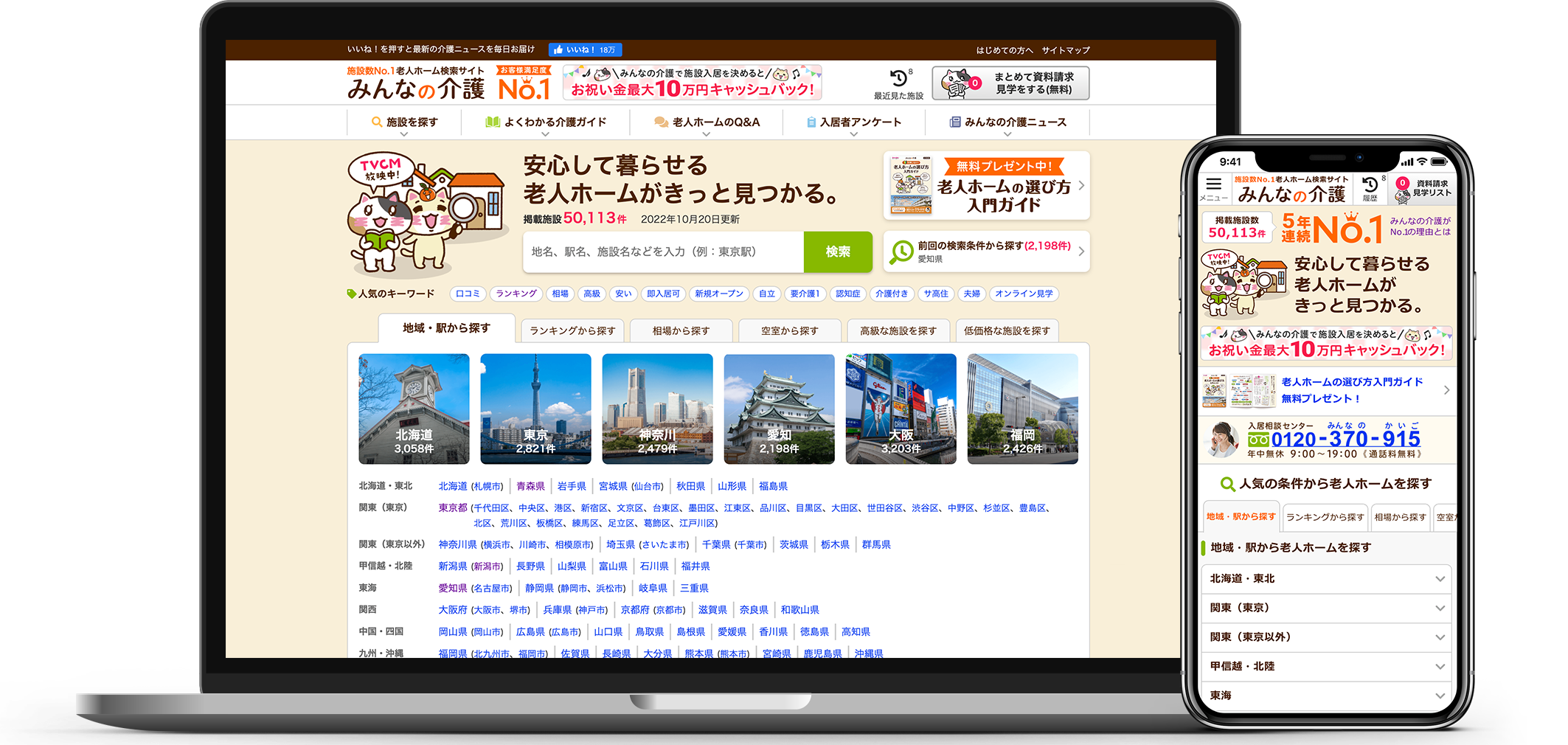 ※主要な老人ホーム検索サイトを対象に掲載施設数の調査を行った結果、みんなの介護がNo.1を獲得しました。