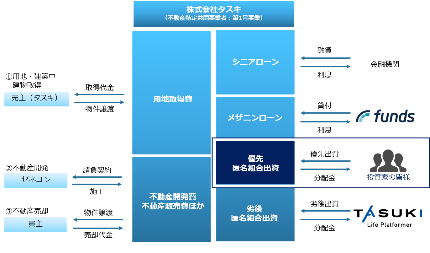 なお、本ファンドにおける用地取得ならびに開発にかかる費用の一部は、匿名組合出資のほか、金融機関のシニアローン及び株式会社ファンズ(以下、ファンズ社)が販売する貸付型ファンドのメザニンローンによって調達されています。ファンズ社を通じた資金調達については、2022年5月9日付当社リリース(※)にて発表しておりますファンズ社と当社の協業の一環となります。