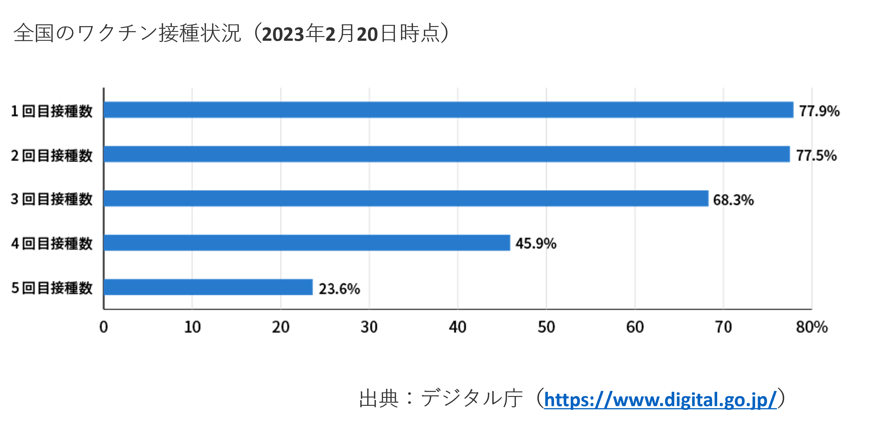 このアンケート調査の結果を踏まえつつ、デジタル庁が発表しているデータを見てみると、接種回数が増えるにつれ、接種率が減少していることがわかります。一定数ワクチン接種を行っているものの、有料であれば接種しないという声も多いことから、今後有料になるかはまだ発表されていませんが、5類への移行後はコロナワクチンを接種する人の割合は現在以上に減っていくのではないかと推測されます。
