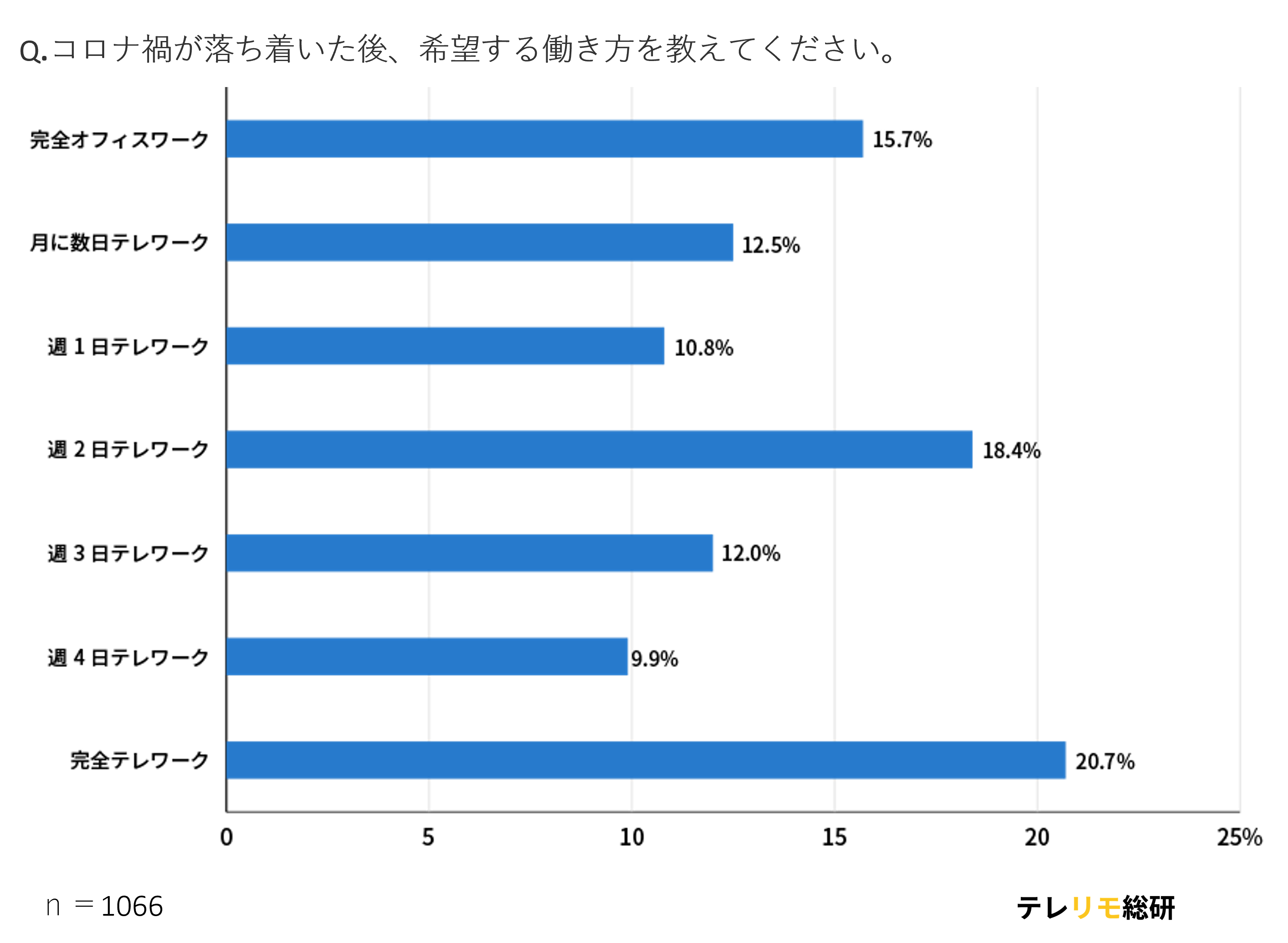 調査の結果を見ると、完全オフィスワークを希望するという回答は15.7%。逆に、月1回でもあったとしても、テレワークを希望するという割合は84%となっており、なかでも完全テレワークを希望する声は20.7%と最も多い回答となりました。