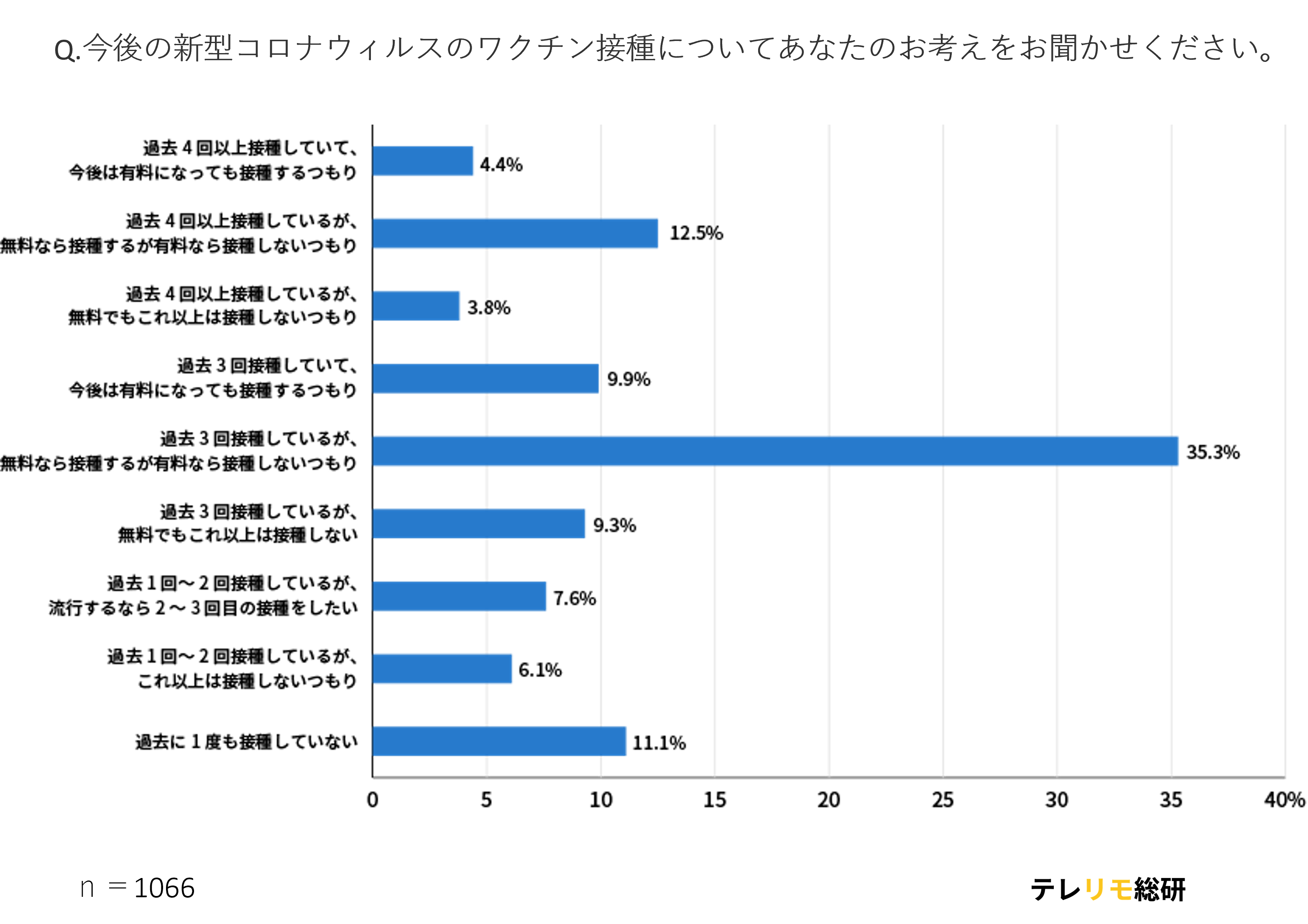 アンケートの回答を、有料か無料かの観点で見てみると、「有料でも接種する」という回答は14.3%。「無料であれば接種を考える(有料なら接種しない)」という回答は47.8%となり、「今後の接種は考えていない」と回答された方が19.2%でした。