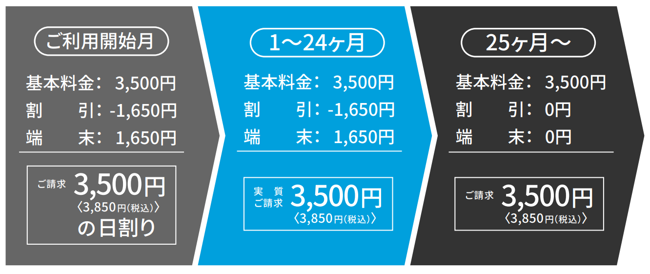 端末代金39,600円(税込43,560円)を分割(24回払い)でお支払いの場合、ご請求基本料金より1,650円(税込1,815円)を24回割引いたしますので、実質無料でDXmobileをご利用いただけます。